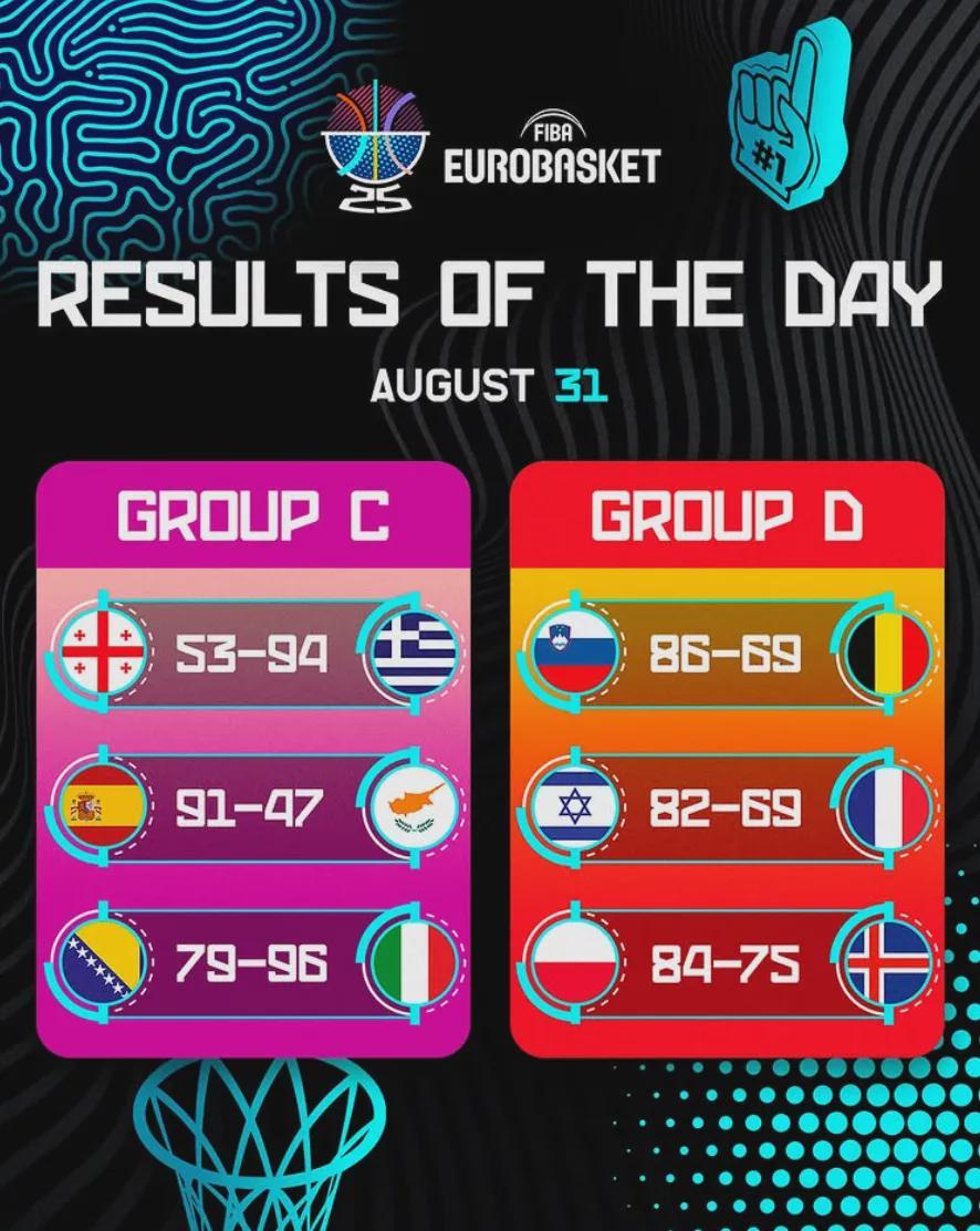 格鲁吉亚53比94希腊,西班牙91比47塞浦路斯,波斯尼亚79比96意大利,斯洛文尼亚86比69比利时,以色列82比69法国,波兰84比75冰岛。