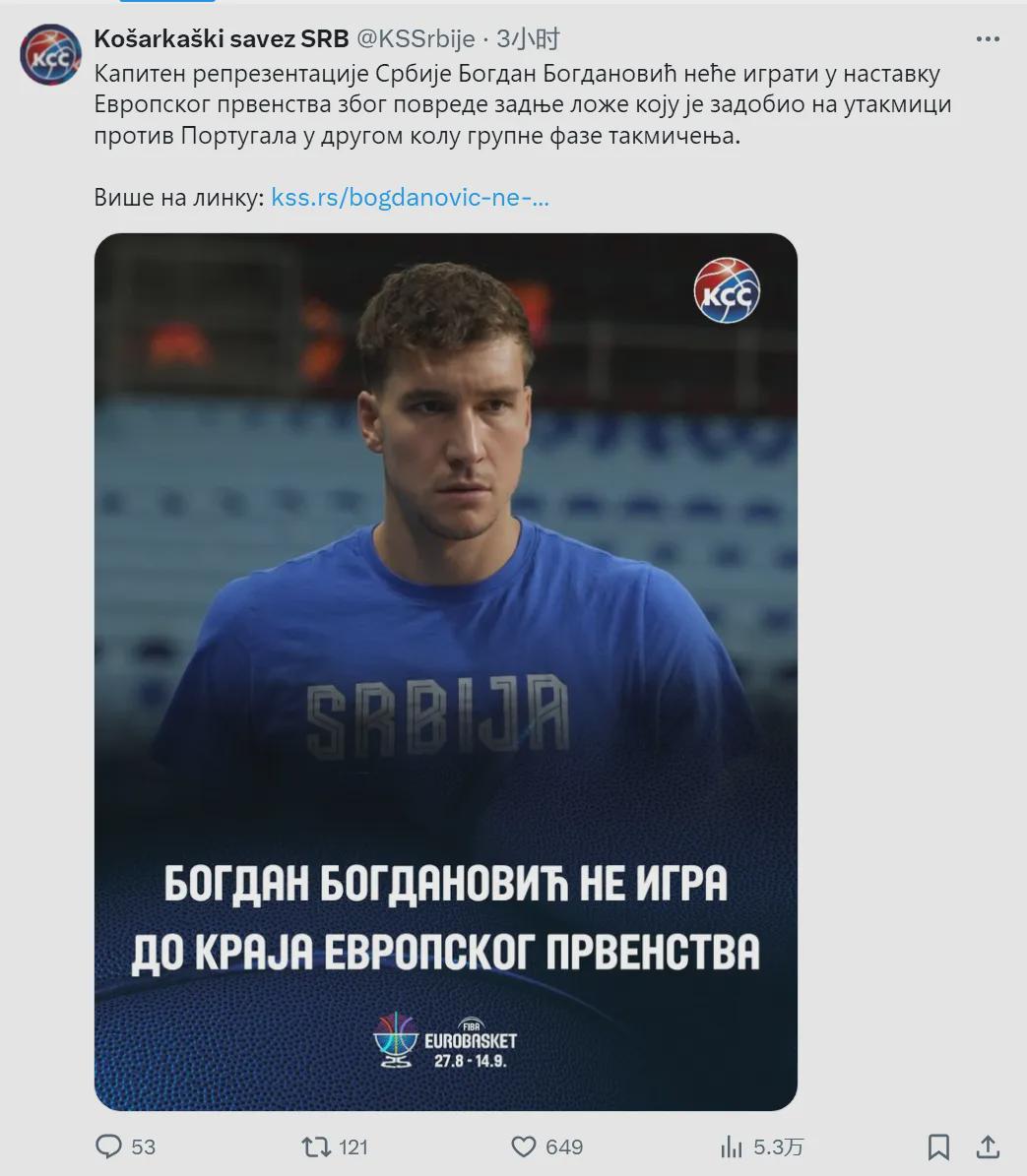 今天,博格丹诺维奇的情况终于被透露了:腿筋撕裂,直接报销,退出本届欧锦赛的征程。