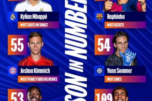 华体会体育-欧冠各项数据之最:姆巴佩射正王,亚马尔过人王,拉菲尼亚助攻王