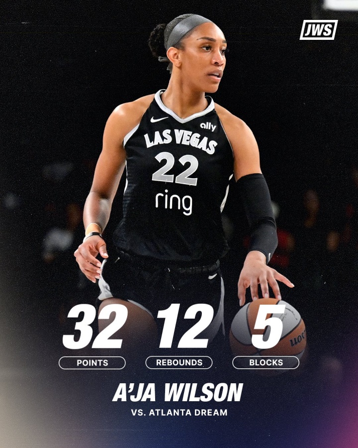 核心球员阿贾-威尔逊本场仅休战3分钟,全场24投12中,三分4中2,罚球6罚全中,狂揽32分12篮板4助攻并送出5记封盖。